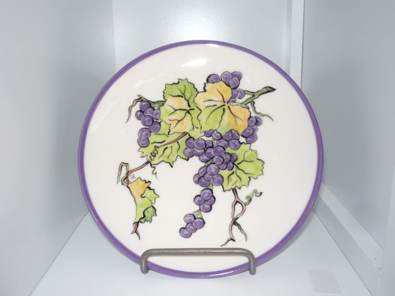 Smaller round grape design plate, hand painted. Purple rim. 19.5cm diameter. Dishwasher, Microwave and Oven Proof.Postage to the north island to be arranged at point of sale