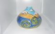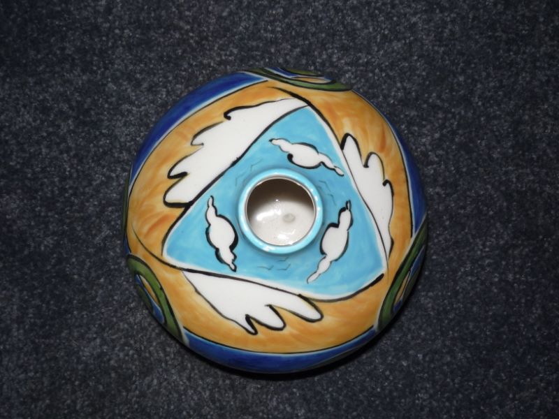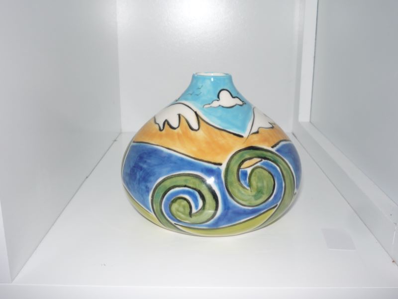 This Koru design wraps right round the vase. It tapers in at the top. Widest part at the bottom is 14cm diameter, then tapers in at the top to 3cm diameter. Hand painted.Postage to the north island is $13.80