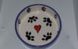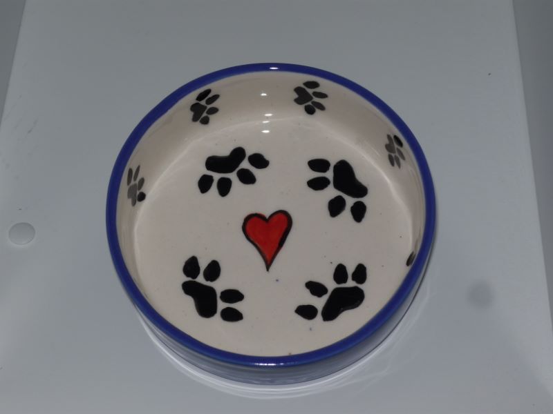 Round shallow pet bowl with paw prints and heart, greek blue colour. 13.5cm diameter x 4cm deep. Hand painted.