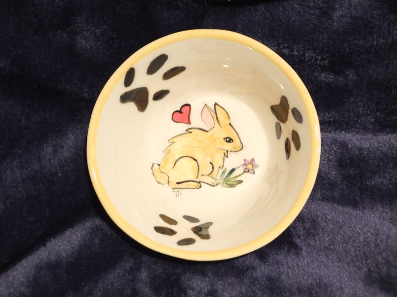 Small round Rabbit dish, Golden Wheat Rabbit, with heart and flower, and paw prints. Golden Wheat colour on the outside.Hand Painted. Dishwasher, Microwave, and Ovenproof.