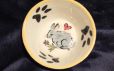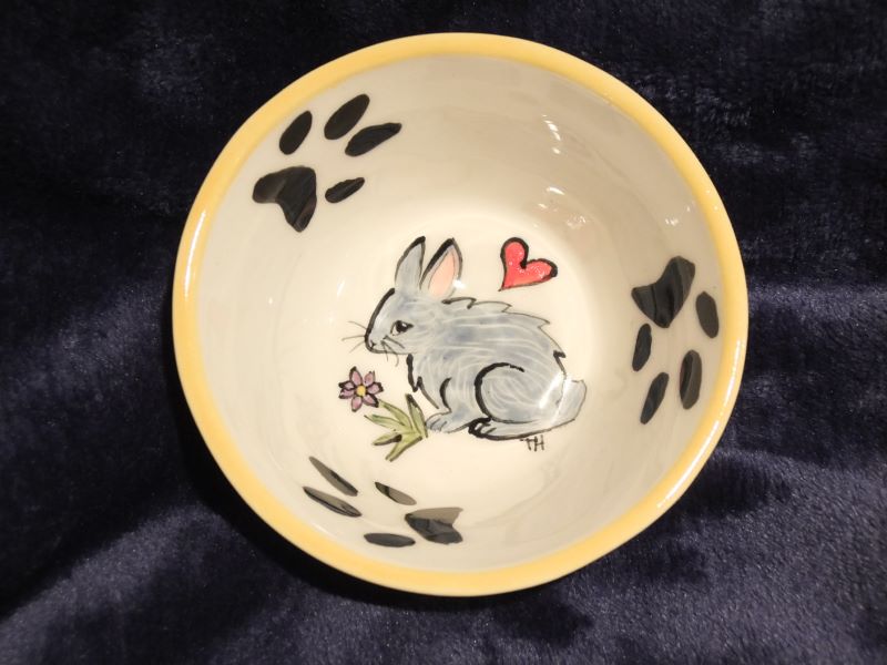 Small round Rabbit Bowl, Light Grey Rabbit, with flower, heart, and paw prints. Bone Colour on the outside. Approx 11cmx5cm. Hand Painted. Dishwasher, Microwave, and Ovenproof.Thank you for viewing my pottery.