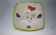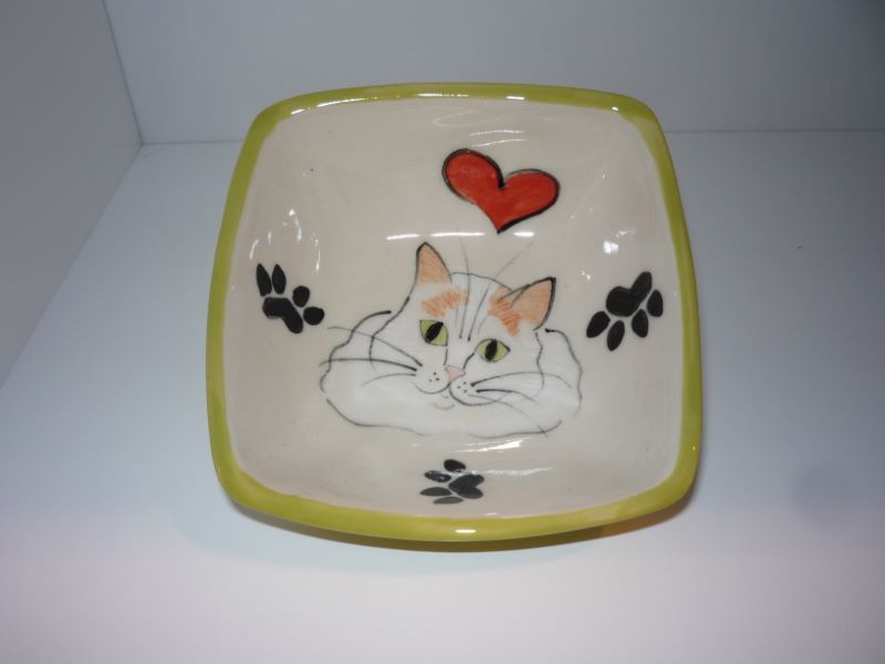 Small Square Cat Bowl, with a White and Ginger Cat. Heart and Pawprints, Chartreuse colour outside. This bowl tapers in at the bottom.12.5cm diameter x 4.5-5cm deep.